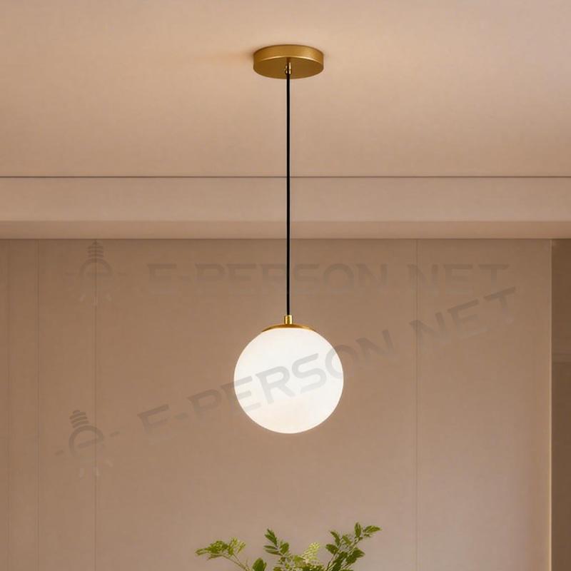 This This indoor pendant light features a single frosted glass ball shade suspended from the ceiling, providing soft and comfortable illumination.