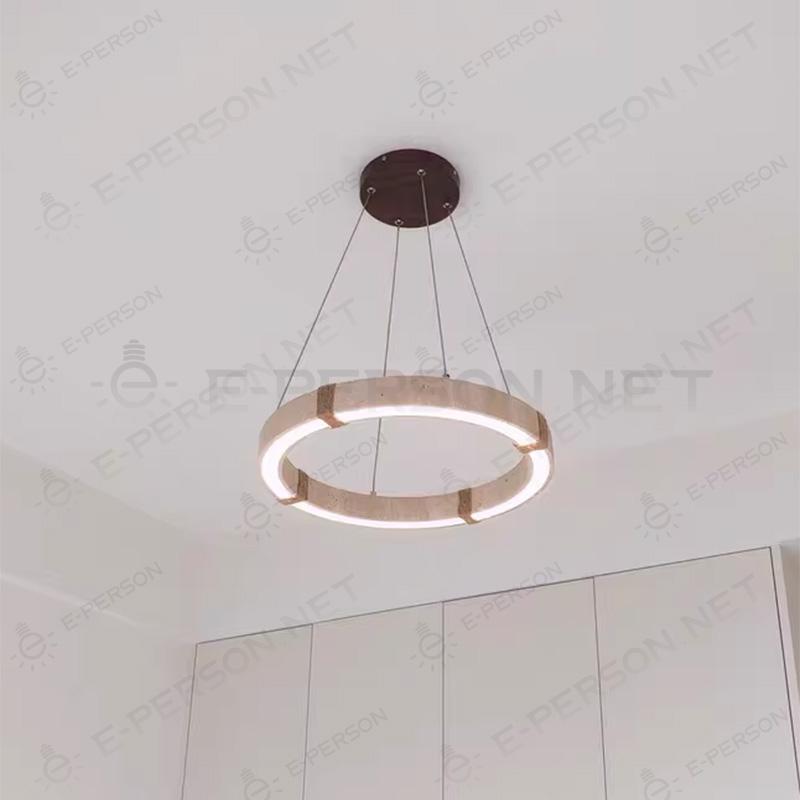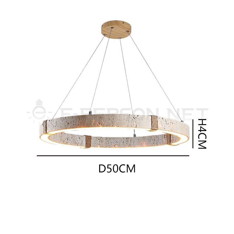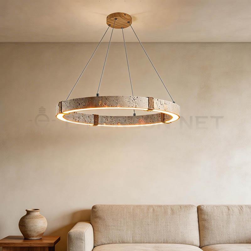 The lampshade is crafted from natural travertine stone, showcasing unique textures and natural patterns that make each piece distinctive. The circular ring design integrates built-in LED lighting, producing a soft and evenly distributed glow that enhances the ambiance of dining spaces.