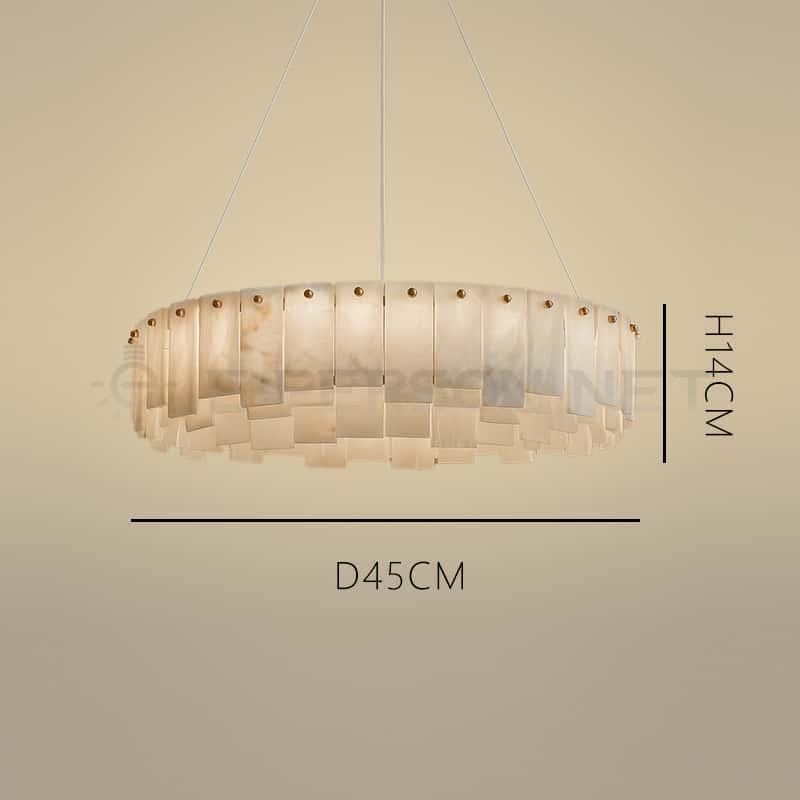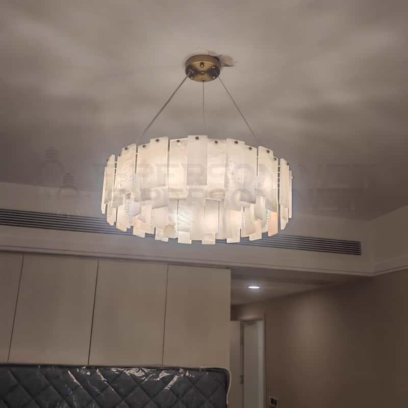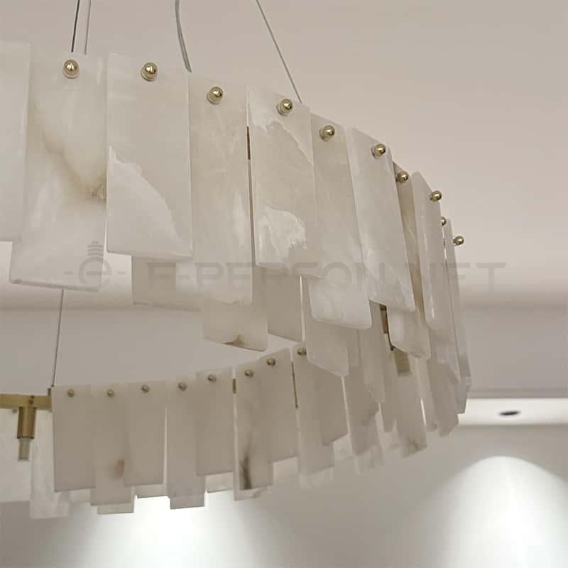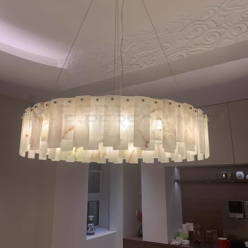 This luxury Marble pendant light features a sleek circular frame adorned with multiple hand-crafted Marble stone panels, creating a soft and elegant glow with rich natural texture. Each stone piece is uniquely patterned, providing a warm and refined ambiance suitable for upscale interiors. The brass accent pins add an exquisite touch, enhancing the sophistication of the design. Suspended by sturdy adjustable wires, this chandelier delivers both visual impact and durability. Ideal for living rooms, dining areas, hotel lobbies, villas and high-end interior projects, it offers a perfect blend of modern simplicity and artistic craftsmanship. Compatible with LED lighting for energy-efficient performance.