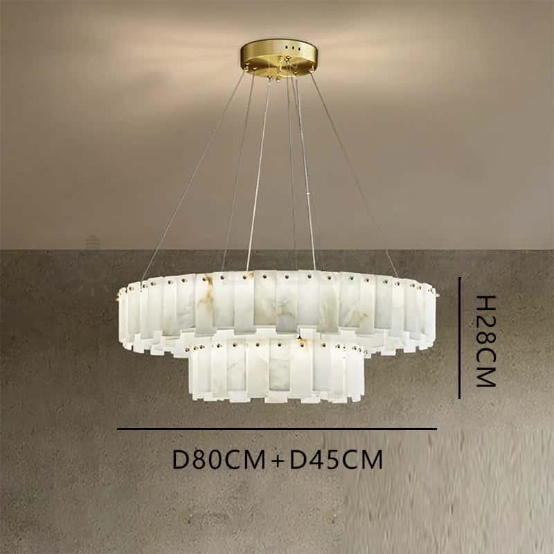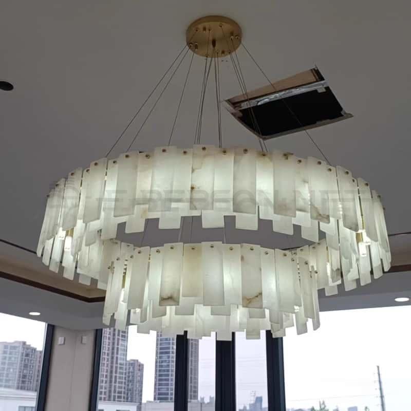 This luxury linear chandelier features a stunning design crafted from multiple Marble stone slabs, each showcasing unique natural textures and soft translucency. The silhouette offers an elegant and modern statement perfect for dining rooms, living rooms, villas, and upscale hotel interiors. The warm glow diffuses beautifully through the Marble panels, creating a refined ambiance with artistic character. Supported by sturdy adjustable suspension wires and complemented with subtle brass accent details, this chandelier delivers both visual sophistication and long-lasting durability. Ideal for high-end residential and commercial lighting projects, and compatible with energy-efficient LED lighting.