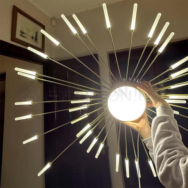 This modern chandelier features a radiant starburst design with multiple metal arms extending from a central body, creating a bold and eye-catching visual effect.The evenly distributed light elements form a balanced and sculptural silhouette, making it a true statement piece in contemporary interiors.