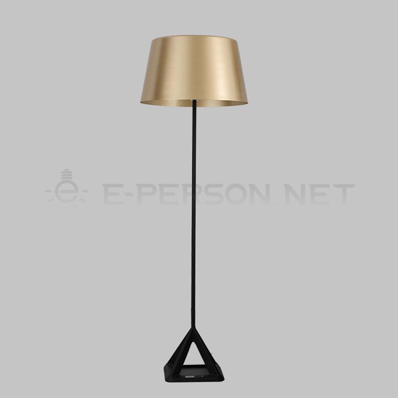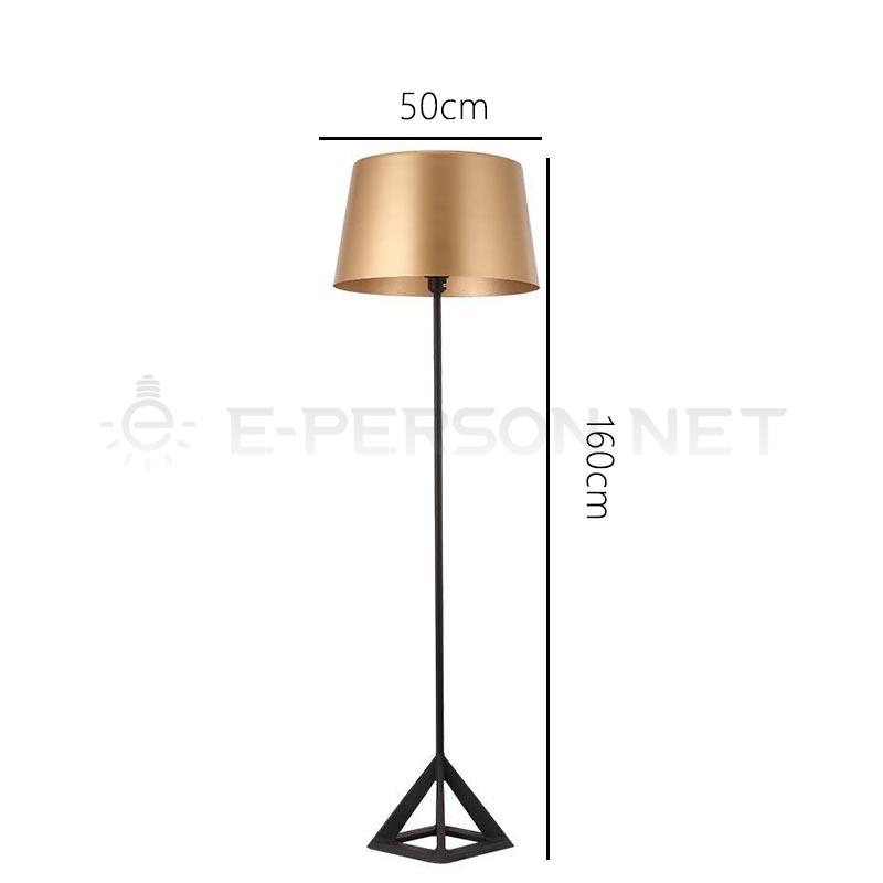Make a bold statement with this contemporary floor lamp, designed to merge form and function. It features a striking geometric black pyramid base that provides visual intrigue and excellent stability. The golden metal lampshade emits a warm ambient glow, perfect for elevating the atmosphere of modern interiors.