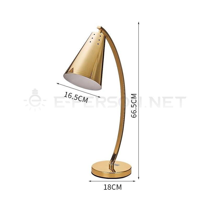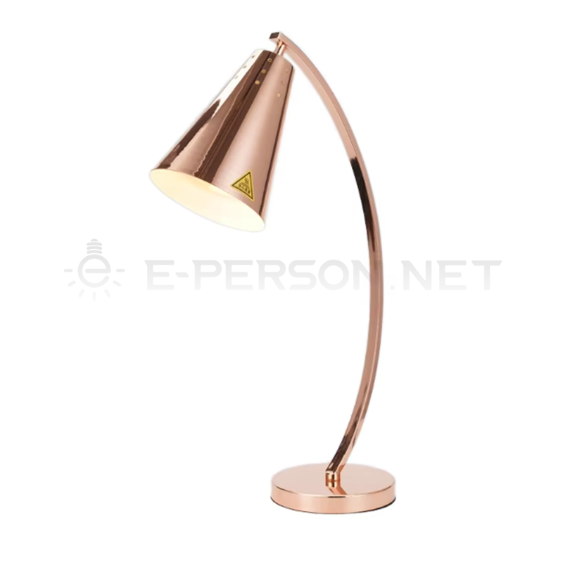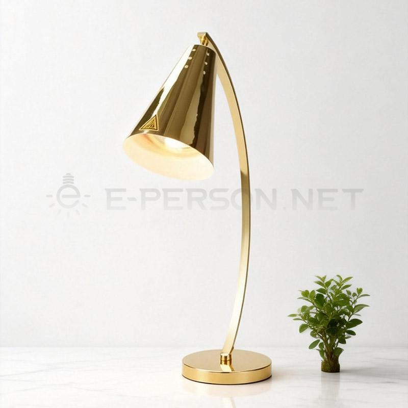 This modern table lamp features a sleek curved metal arm and a refined cone-shaped lampshade, creating a perfect balance between elegance and functionality.