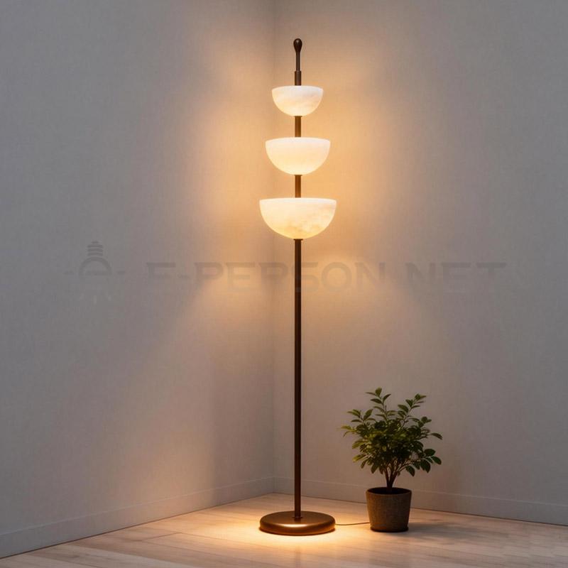 This modern floor lamp features multiple alabaster shades arranged in a vertical composition, creating a soft layered lighting effect and strong visual presence.