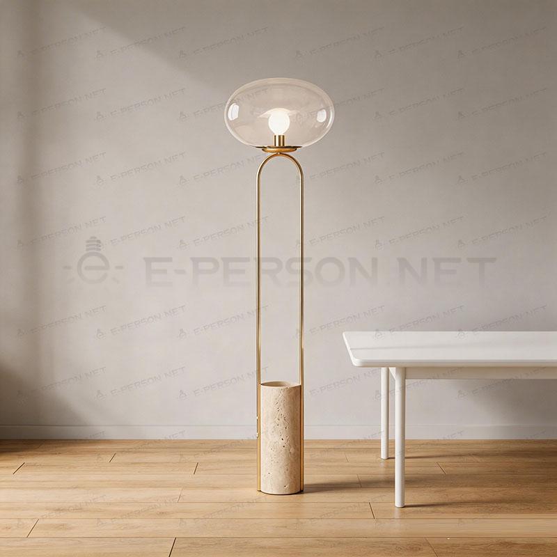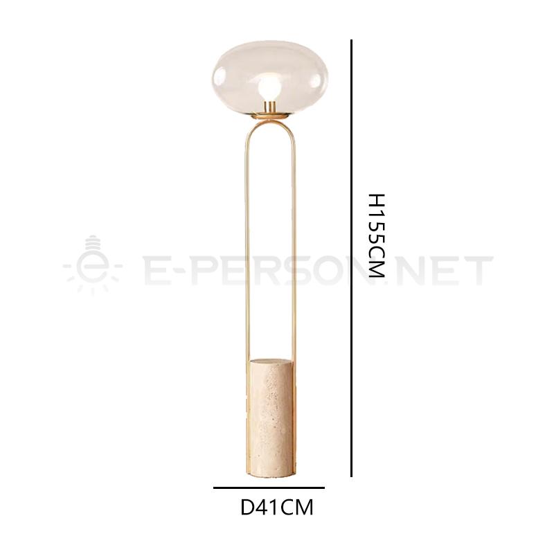 This elegant floor lamp seamlessly merges natural travertine, clear glass, and polished gold metal to create a statement piece that elevates any interior. The solid travertine base, with its distinctive porous texture, anchors the design, while the sleek U-shaped gold metal frame adds a touch of modern sophistication. Atop the frame, a large, oval-shaped clear glass globe encloses a warm light source, casting a soft, diffused glow that enhances the ambiance of your space.