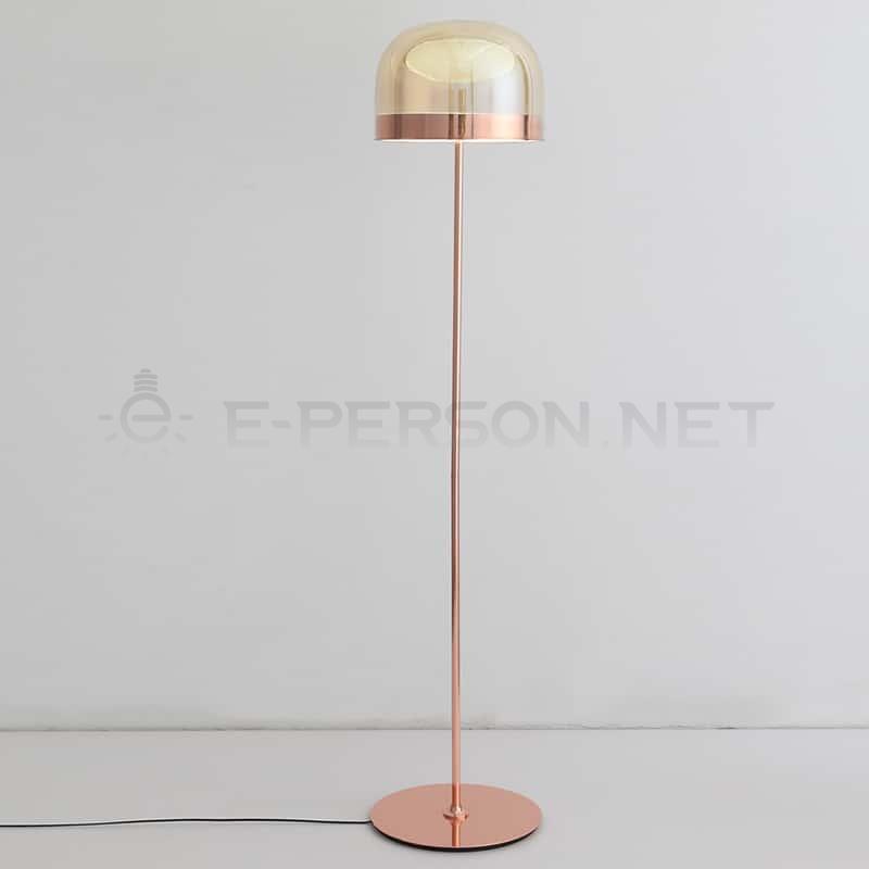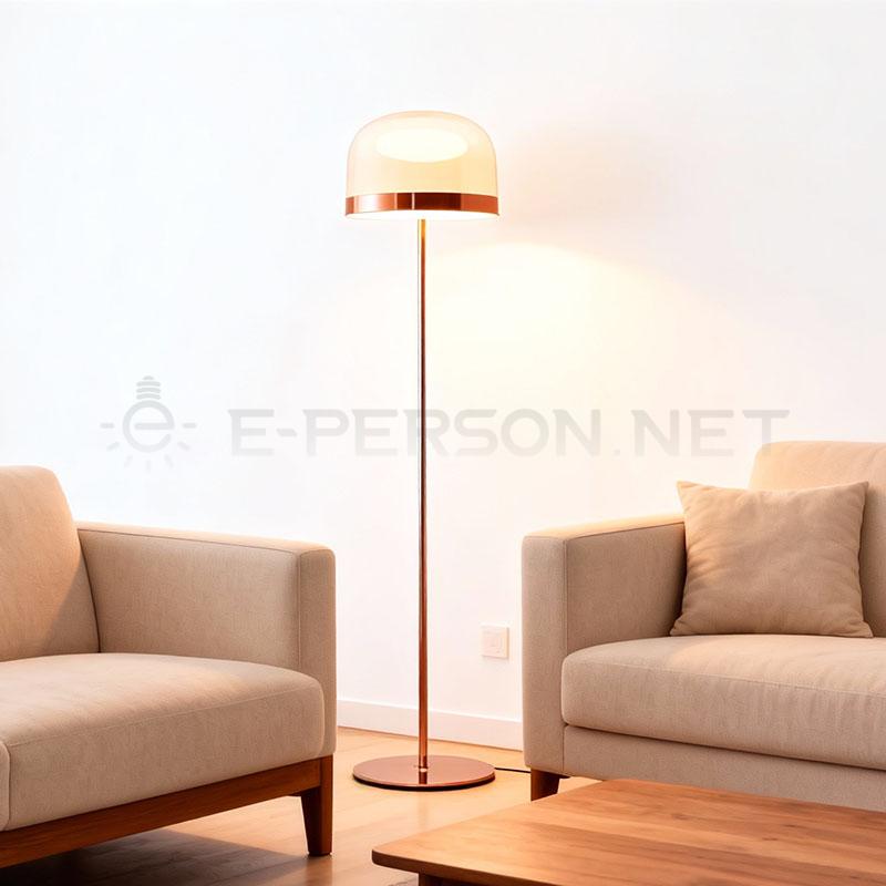This modern designer floor lamp features a half-sphere glass lampshade combined with a sleek iron frame, presenting a perfect balance of artistic style and durable construction. The dome-shaped glass diffuses light softly, creating a warm and elegant ambiance ideal for both functional lighting and decoration.