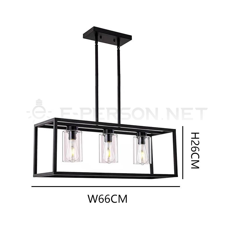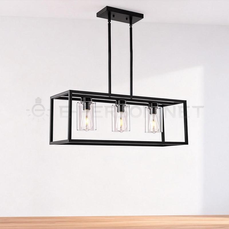 This modern industrial linear pendant light features a strong black metal rectangular frame combined with clear glass shades, creating a clean, structured look with a vintage industrial touch.