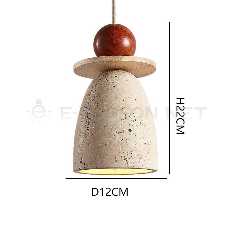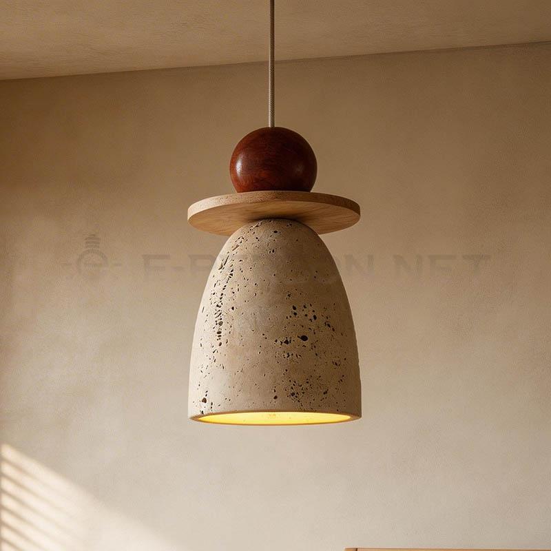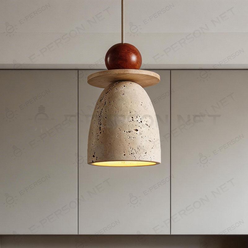 This mini pendant light features a natural travertine stone body combined with a solid wooden top detail, creating a warm and organic modern aesthetic.