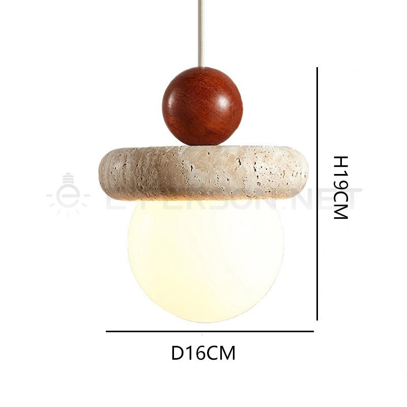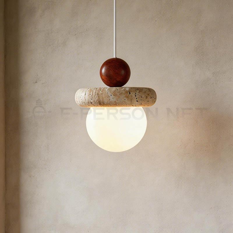 This small pendant light combines natural travertine stone with solid wood details, creating a warm and organic modern aesthetic.