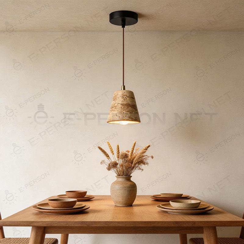 Crafted with high-quality yellow travertine, the cone-shaped lampshade features unique natural pores and earthy tones, embodying the essence of wabi-sabi aesthetics that celebrate imperfection and natural beauty. The matte black ceiling mount and warm-toned suspension cord create a striking contrast, while the brass accent at the base adds a hint of elegance.