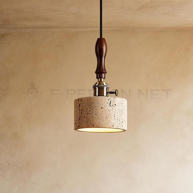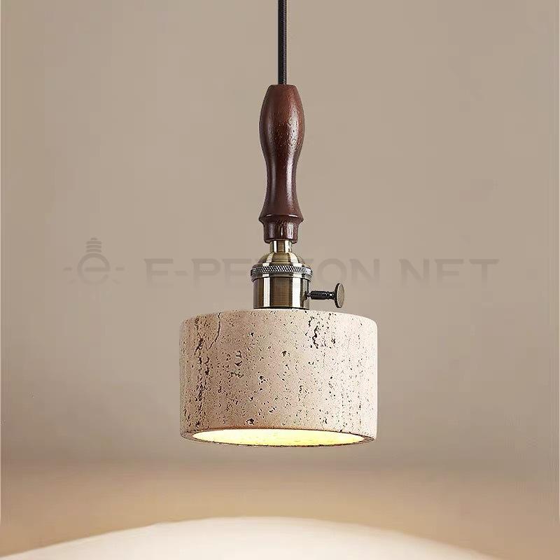 This modern pendant light combines natural travertine stone, brass metal accents and a wooden handle design, creating a warm and elegant lighting piece inspired by Nordic minimalism and natural aesthetics.