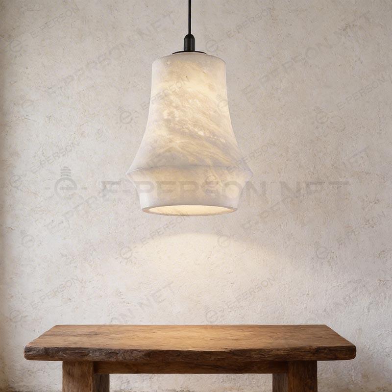 This bell-shaped alabaster pendant light features a layered silhouette that enhances light diffusion and visual depth. The marble-effect shade softly glows when illuminated, creating a warm and inviting atmosphere.