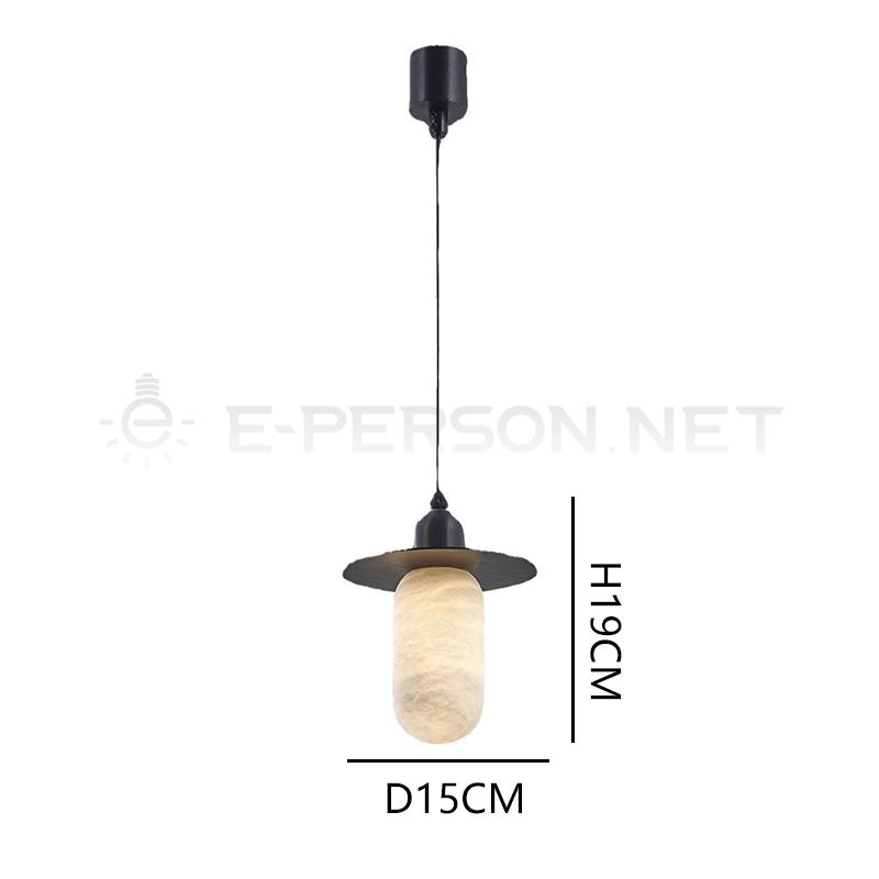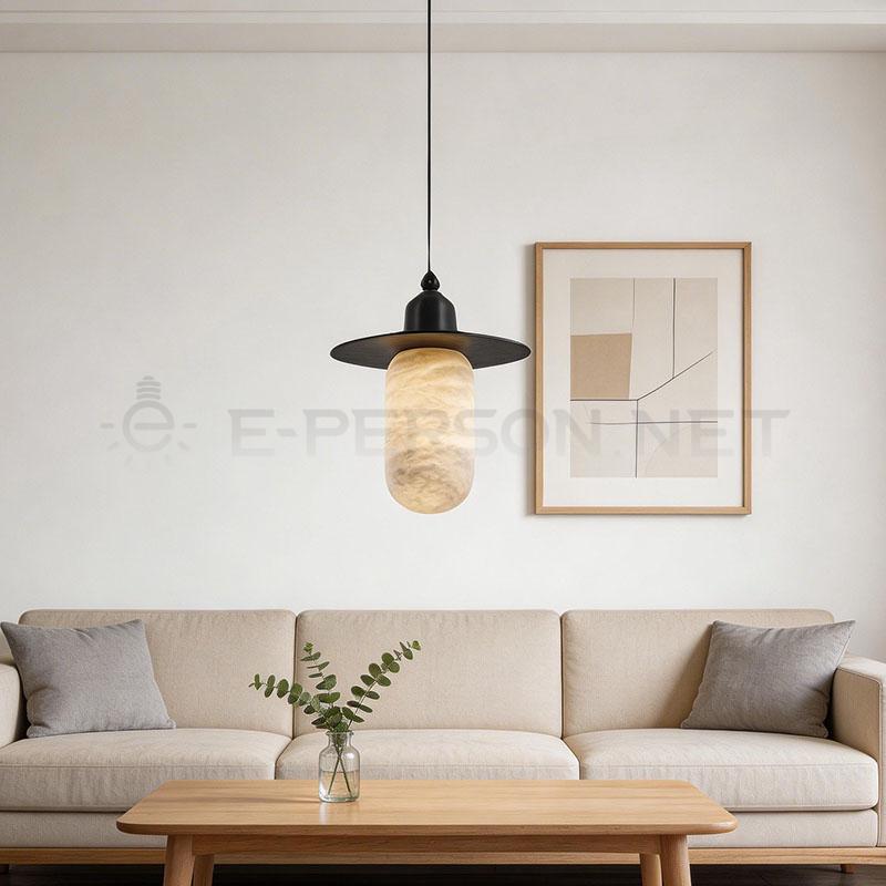 This pendant light combines a bold black metal top with a soft alabaster cylinder shade, creating a modern contrast between strong structure and warm illumination.