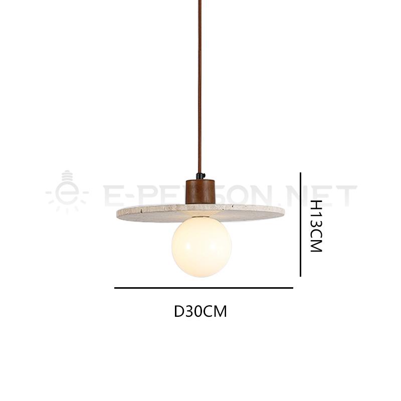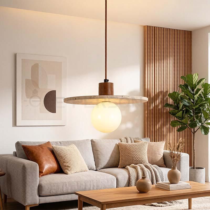 This minimalist pendant light features a flat stone disc combined with an exposed globe bulb. The simple geometric form delivers a modern aesthetic while providing soft ambient lighting.