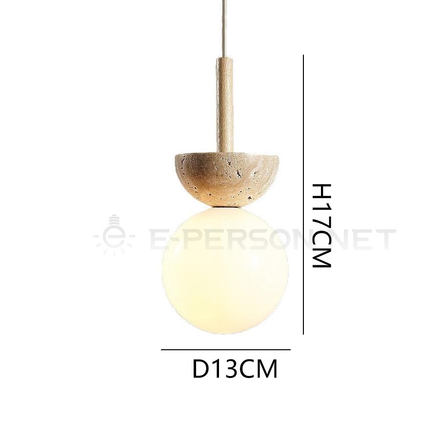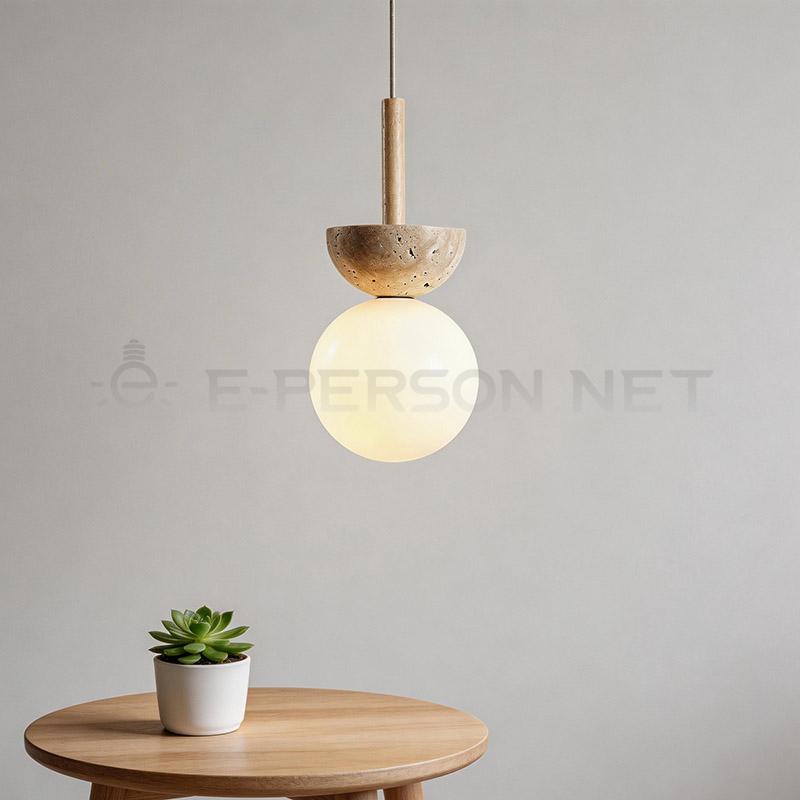 This pendant light combines a natural travertine half-sphere with a glowing glass globe. The layered design creates a balanced composition between solid stone and soft illumination.