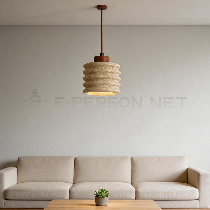 This pendant light features a layered ribbed travertine design that enhances texture and light diffusion. The sculptural shape creates a warm ambient glow while adding visual depth.