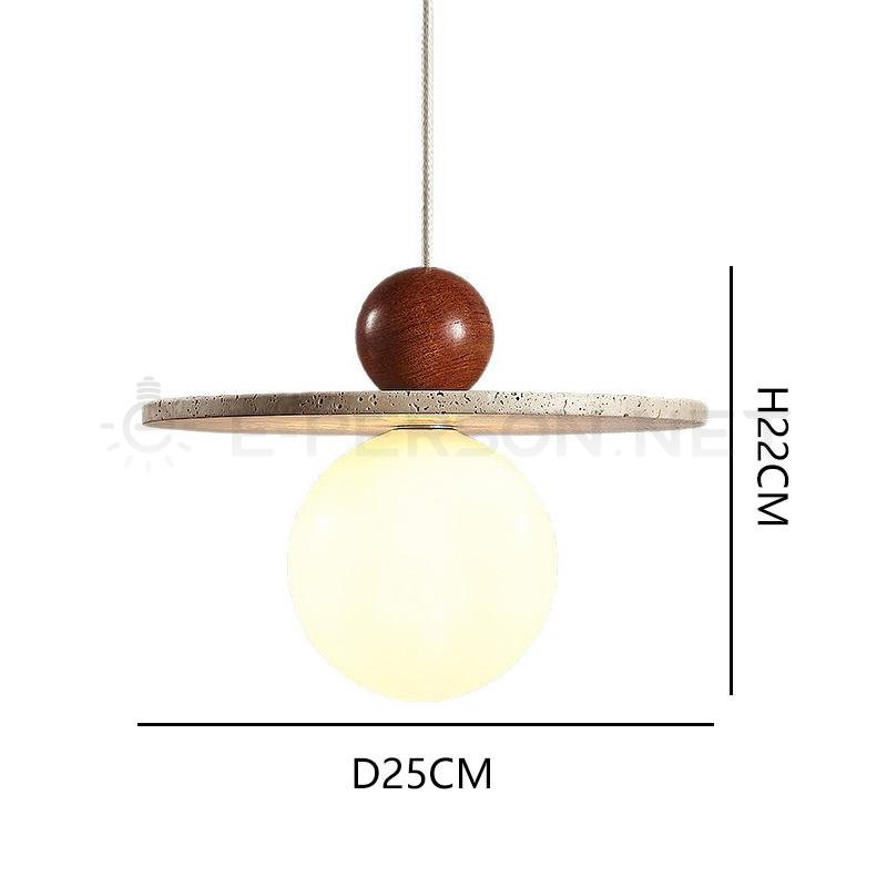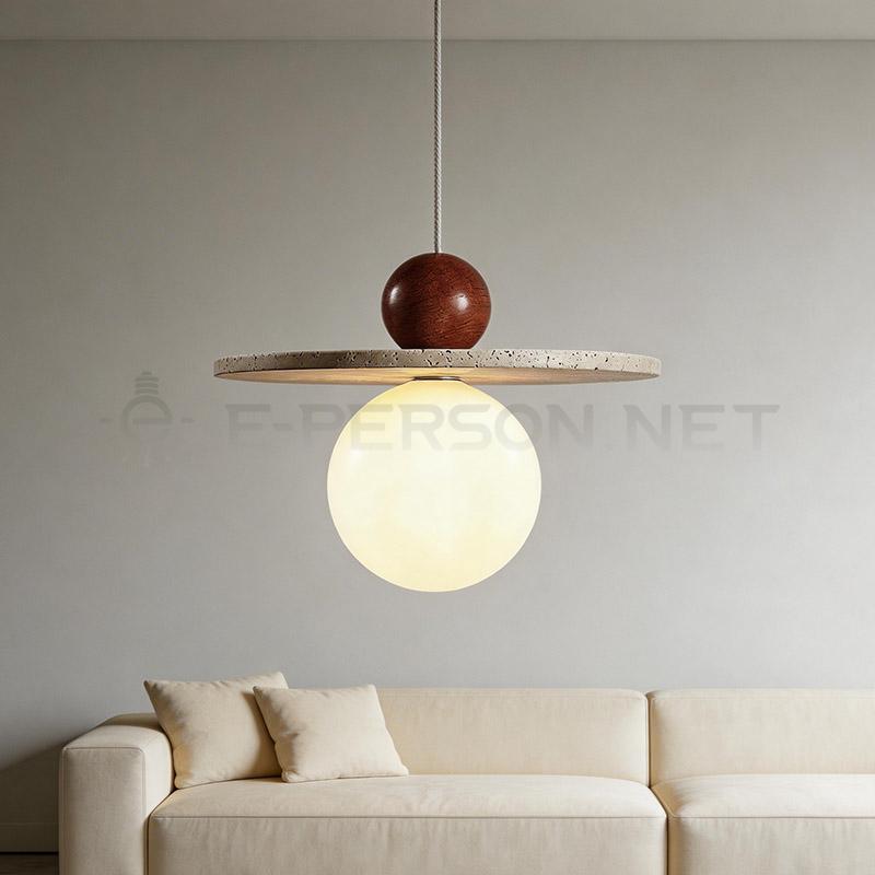 This pendant light combines natural stone, wood, and glass elements into a balanced modern composition. The wooden sphere detail adds warmth, while the stone plate enhances texture.