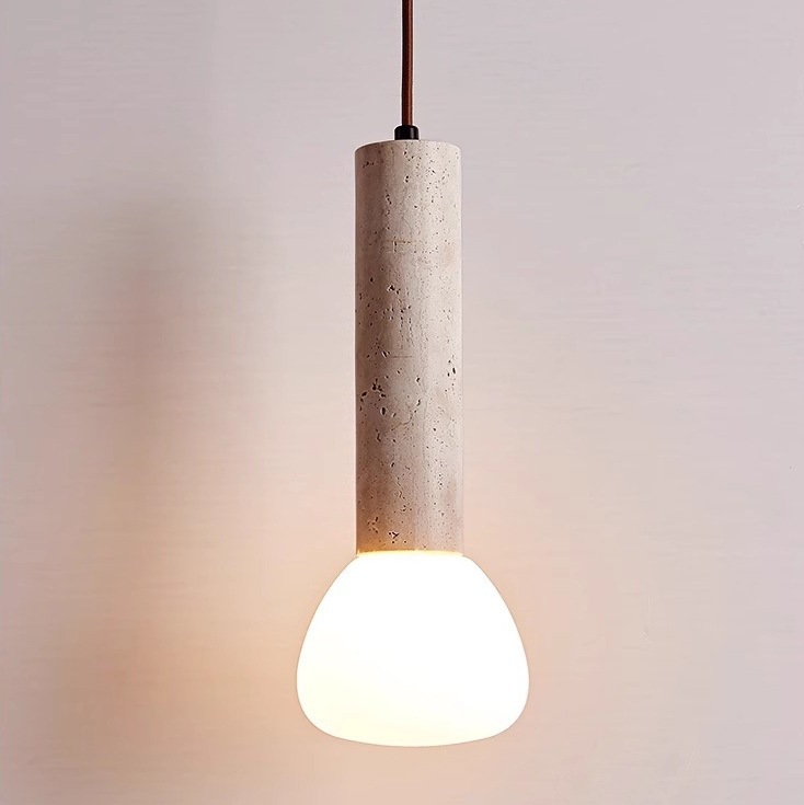 This pendant light combines a travertine cylinder body with a soft glass diffuser, creating a balanced lighting effect. The natural stone texture enhances the warmth of the light.