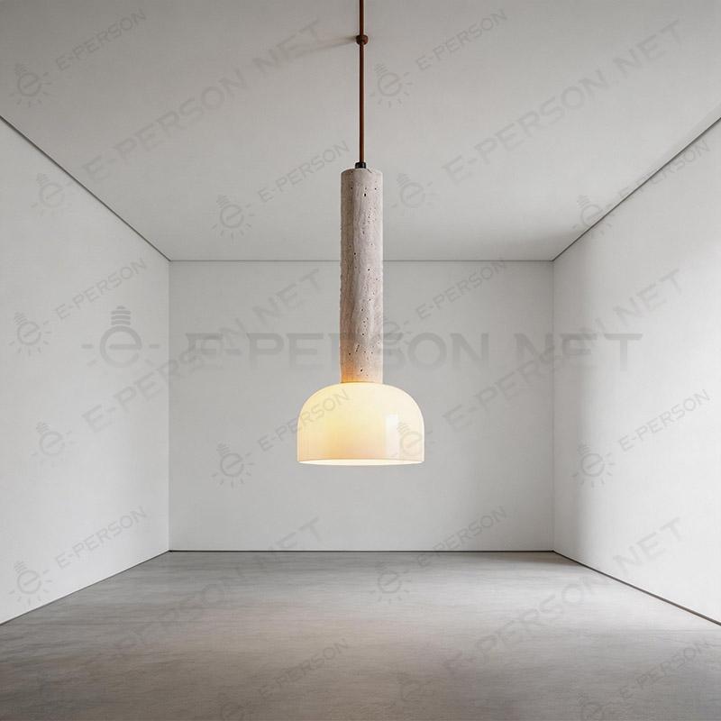This pendant lamp combines a travertine cylinder with a soft glass diffuser, creating a refined and balanced lighting effect. The natural texture enhances the visual warmth.
