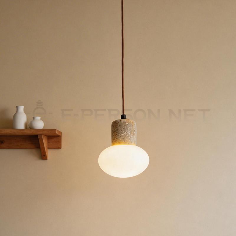 This pendant light combines a natural travertine base with a glowing glass globe, creating a soft and balanced lighting effect. The warm illumination enhances interior comfort.