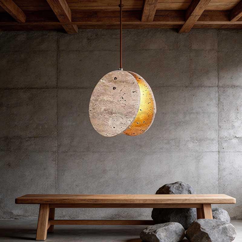 This pendant light features two overlapping travertine discs, creating a layered lighting effect. The design enhances depth and visual interest while maintaining a natural aesthetic.
