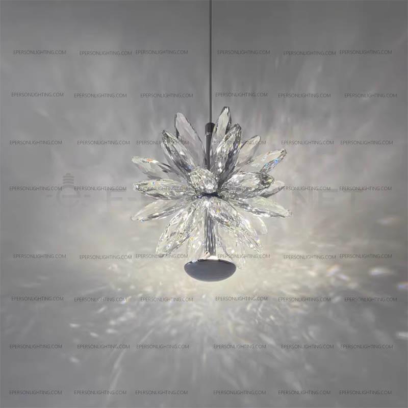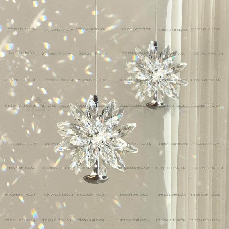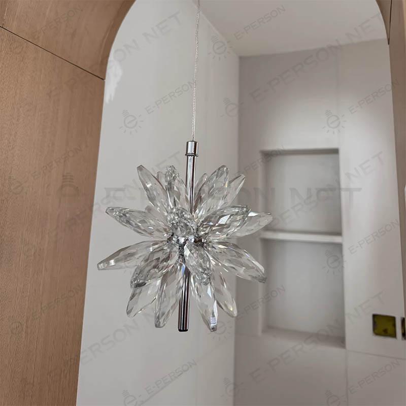 This luxury crystal pendant light features a stunning flower-inspired design with multiple transparent glass petals, creating a sparkling and elegant lighting effect. The unique structure reflects light beautifully, adding a sense of sophistication and luxury to any interior space.