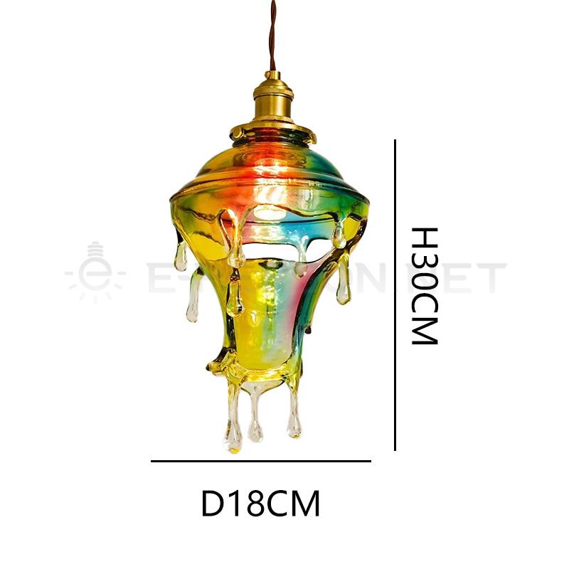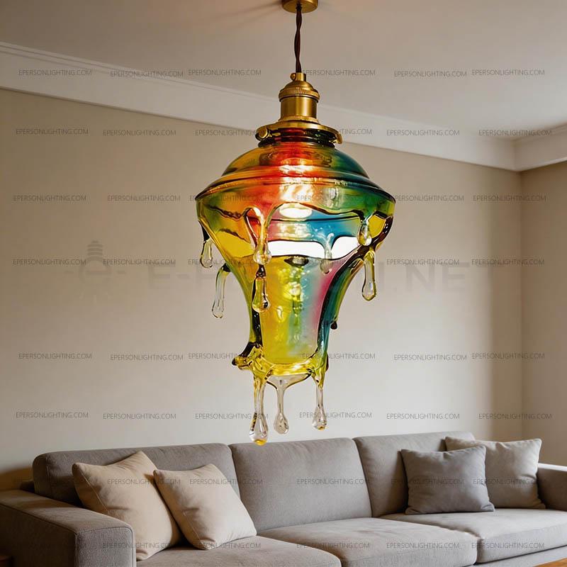 This artistic pendant light features a unique melted resin design with a colorful gradient finish, creating a dynamic dripping effect. The handcrafted appearance adds individuality and artistic value to the lighting fixture.