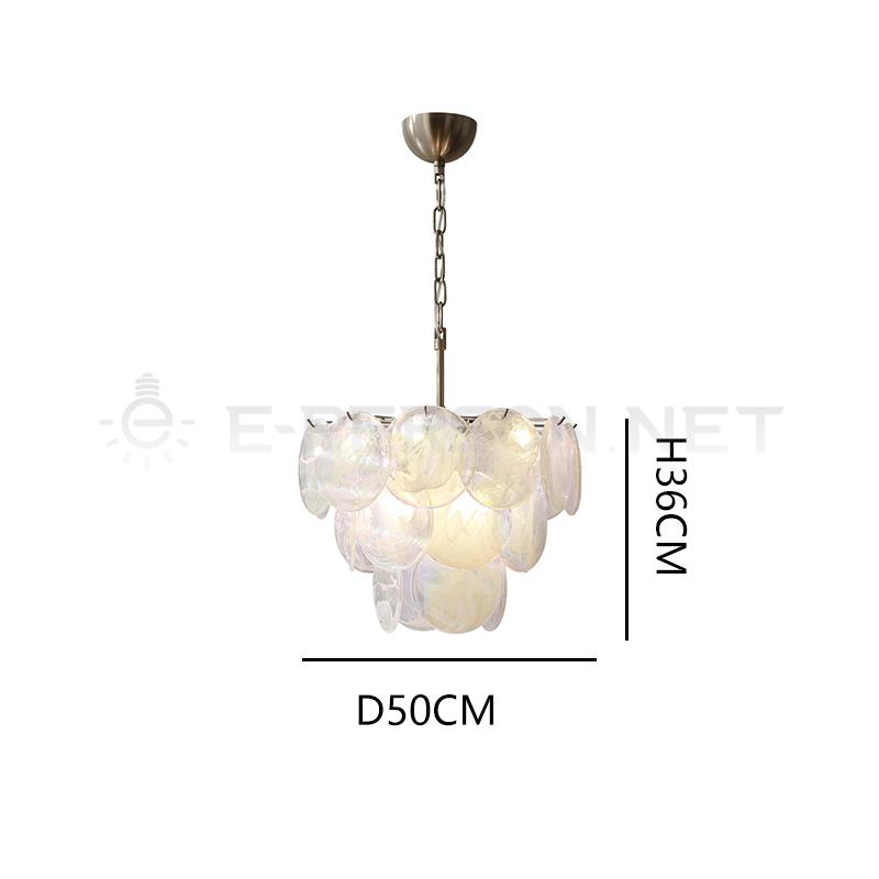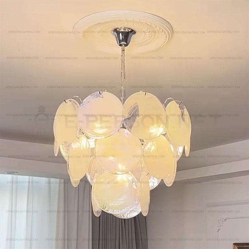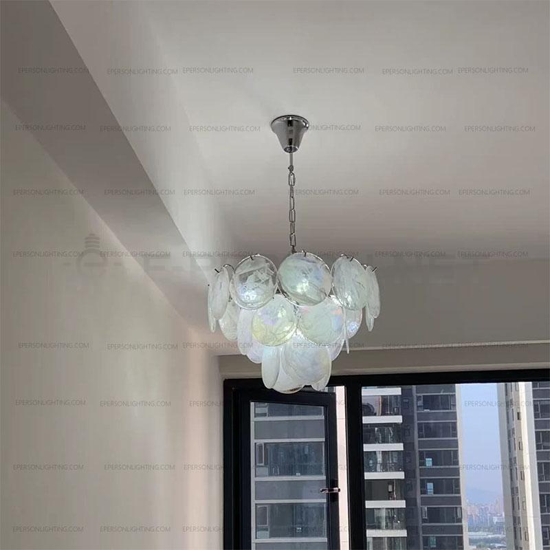This elegant chandelier is crafted with natural capiz shell pieces, creating a soft and luxurious lighting effect. The translucent shell discs gently diffuse light, producing a warm and calming atmosphere. Its layered design adds texture and depth, making it a perfect decorative centerpiece for living rooms, dining areas, bedrooms, and hotel interiors. Combining natural materials with modern aesthetics, this chandelier enhances any space with refined elegance.