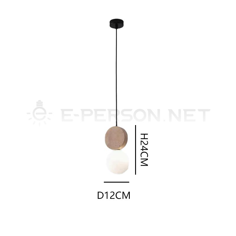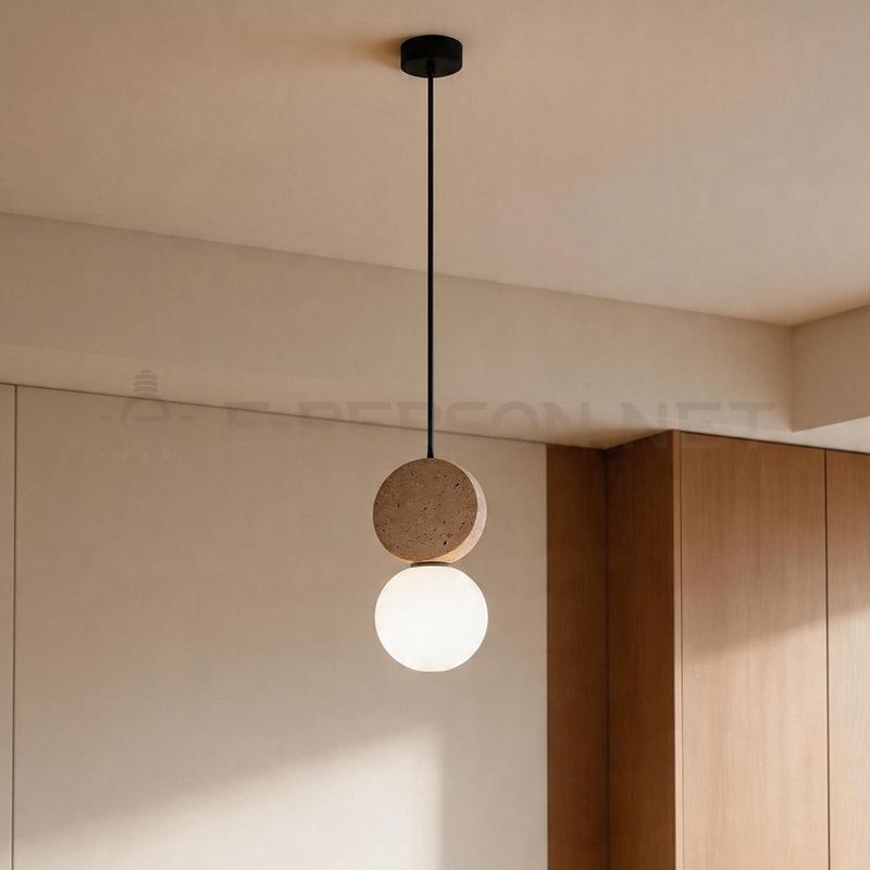 This pendant lamp features a travertine disc paired with a glowing glass globe, suspended in a clean vertical design. The balance of materials creates a soft and elegant lighting effect.