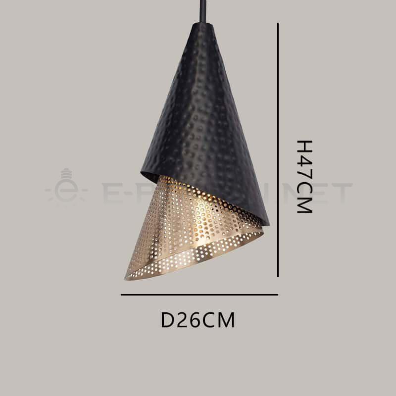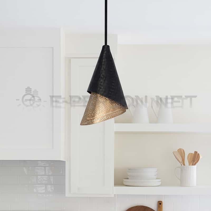 This modern pendant light features a striking dual-layer cone design combining a matte black hammered metal shade with a perforated gold inner cone. When illuminated, the warm light shines through the small perforations, creating a soft, decorative glow and a captivating visual texture. The layered design adds depth and character, making this pendant an eye-catching focal point in any interior.