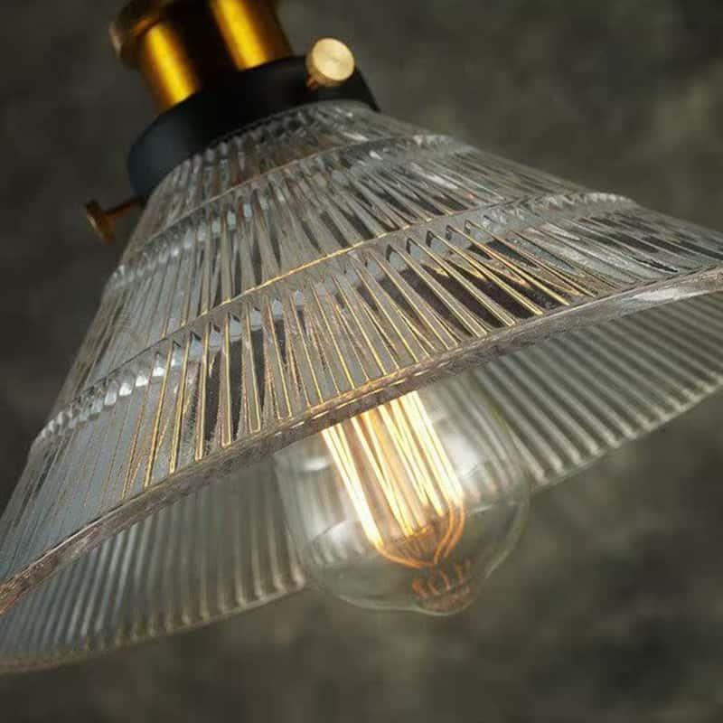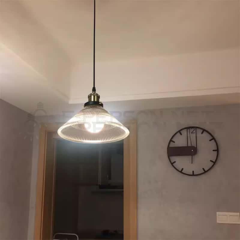 This vintage-style pendant light features a ribbed textured glass shade paired with a retro brass-tone metal lamp holder, delivering both industrial charm and timeless elegance. The cone-shaped glass design creates warm, focused illumination, making it ideal for kitchen islands, dining spaces, cafés, bars, and boutique interiors. Equipped with a standard E27 socket, it supports various bulb styles and allows users to customize the ambience easily. The adjustable fabric cord ensures flexibility in installation, while the durable metal construction guarantees long-lasting performance. A perfect lighting solution for buyers seeking retro aesthetics with modern practicality.