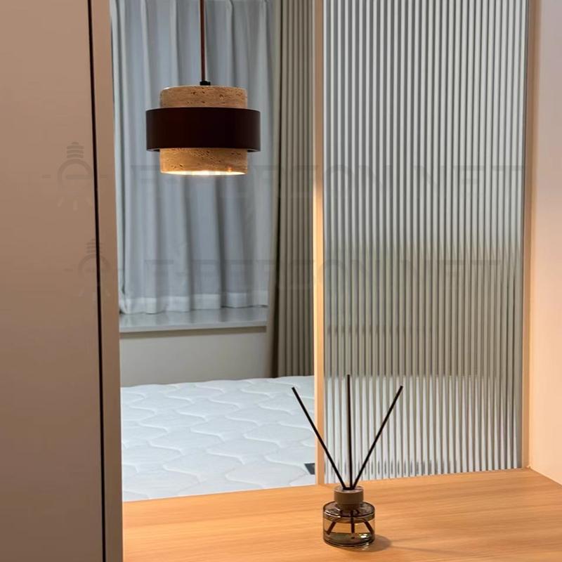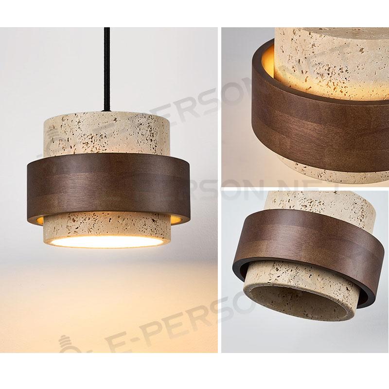 This modern pendant light features a unique natural travertine stone body combined with a warm wood-grain texture middle band, creating a clean and balanced minimalist look. The cylindrical stone shade delivers a refined aesthetic that fits both contemporary and natural-style interiors.