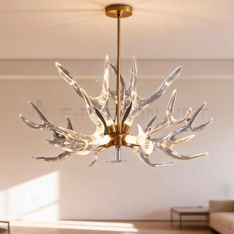 This luxury branch chandelier features an artistic tree-branch-inspired design, crafted with clear glass arms extending from a refined metal center.The sculptural form creates a striking visual impact while softly diffusing light through the transparent glass, delivering a warm and elegant ambiance.
