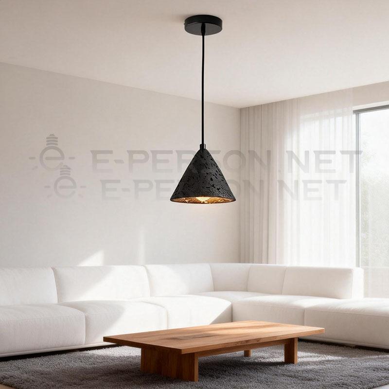 This modern pendant light features a cone-shaped lampshade made of textured volcanic stone, creating a unique natural surface with small pores and irregular details.