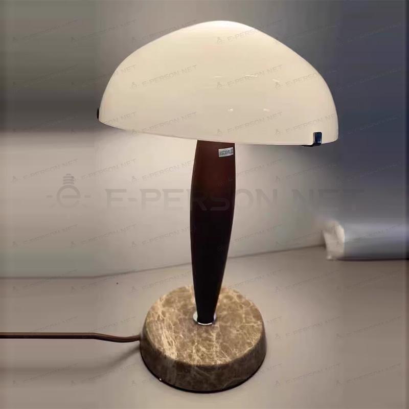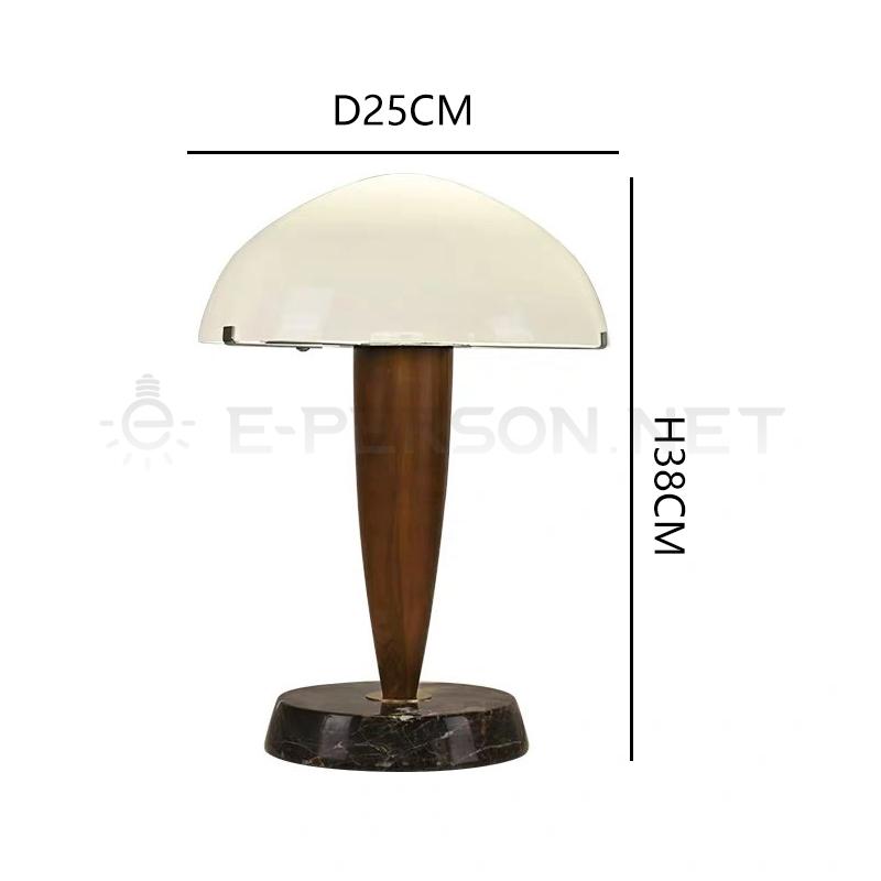 This mid-century modern table lamp features a classic mushroom silhouette, combining a smooth glass dome shade with a refined wooden stem and a solid stone base.The balanced proportions and warm materials create a timeless design that complements both modern and vintage interiors.