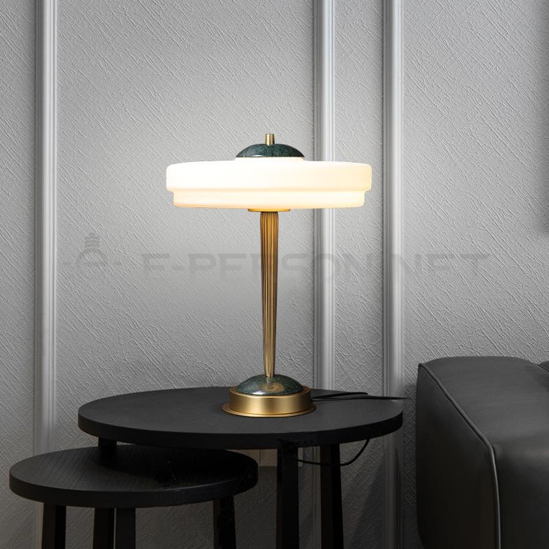 Add a sophisticated touch to your space with this Luxury Modern Brass Table Lamp, featuring an elegant frosted glass disc shade, a sleek brass metal body, and a unique green stone or marble base accent. Inspired by Art Deco elements, this lamp blends classic charm with contemporary design for a truly luxurious feel.
