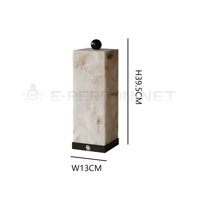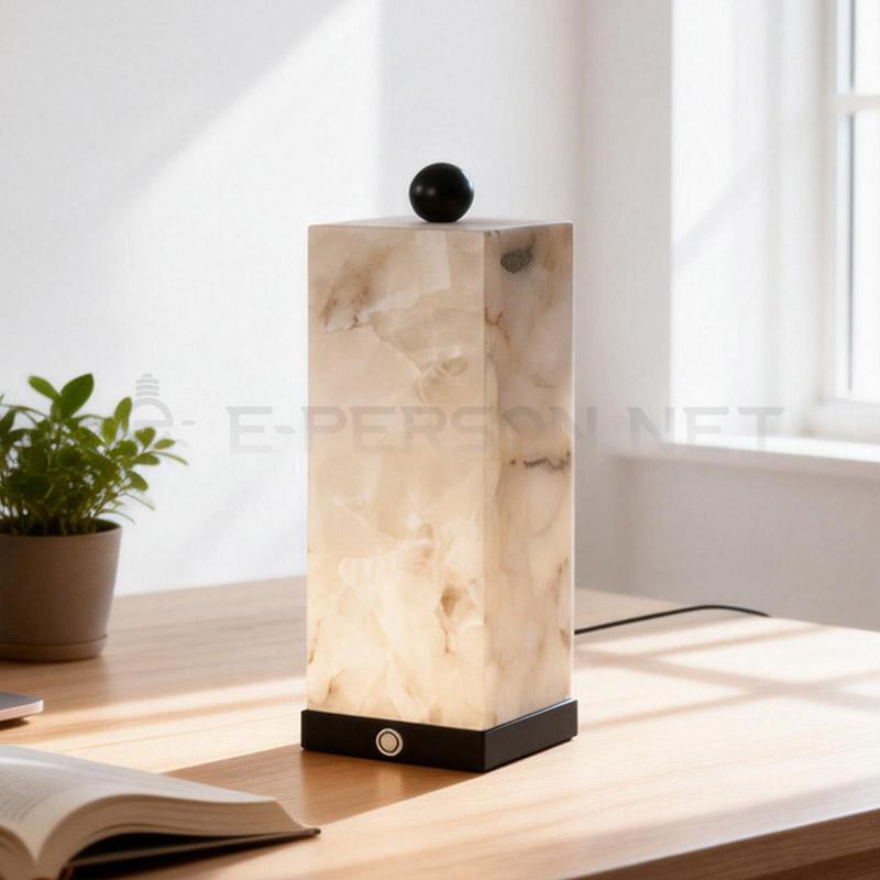This modern square table lamp features an elegant alabaster-effect stone body with a natural translucent texture, creating a soft and luxurious lighting atmosphere.The minimalist column design combined with a black decorative top accent gives the lamp a strong architectural and designer appeal.