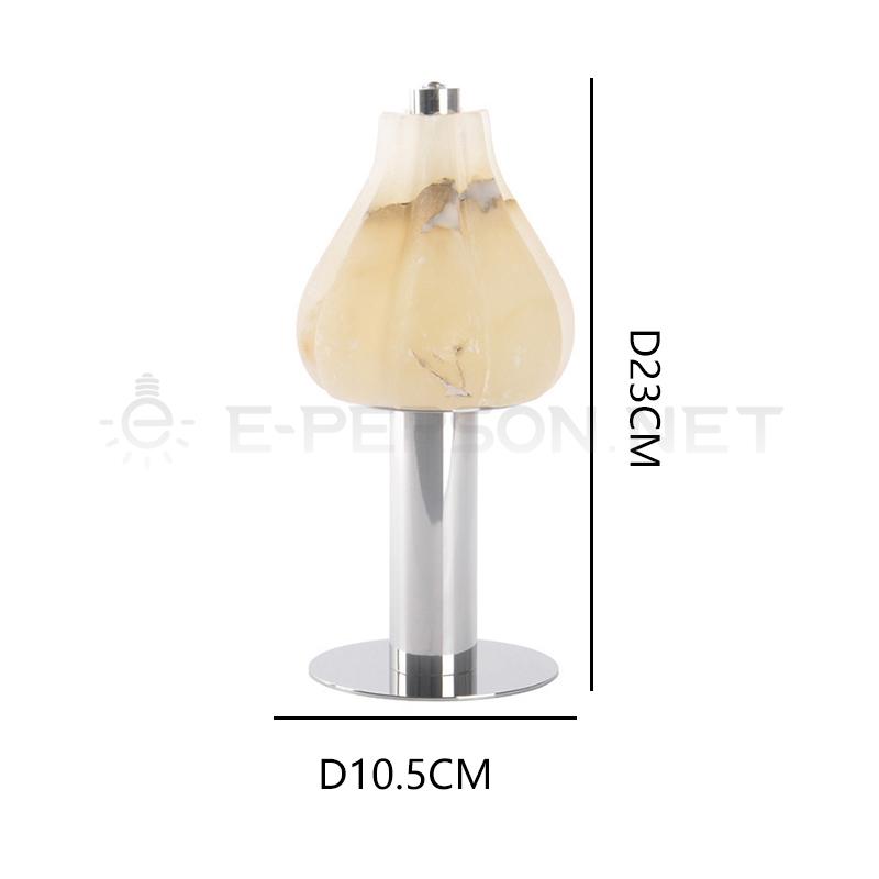 The softly translucent stone highlights natural veining and color variations, ensuring that every lamp is truly one of a kind.Combined with a sleek polished metal column and a stable round base, the design balances artistic form and minimalist structure.