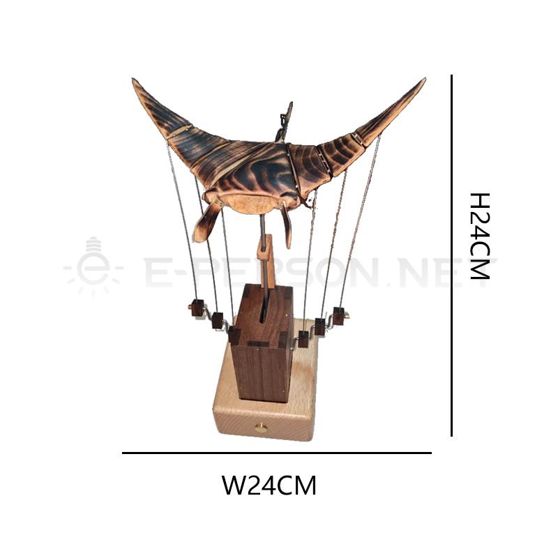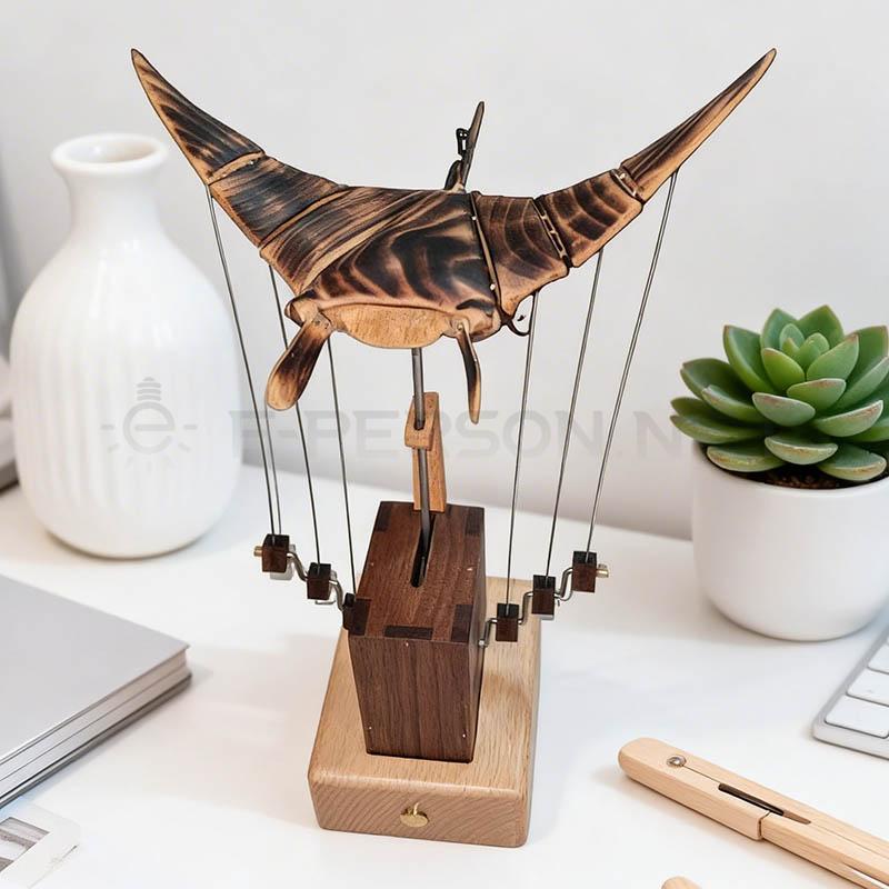 This creative wooden sculpture features a mechanical flying fish design that combines artistic craftsmanship with kinetic movement. The carefully carved wooden wings and body create a dynamic appearance, making the sculpture look as if the fish is gliding through the air.