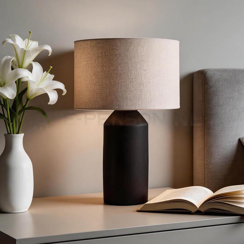 This minimalist table lamp features a clean cylindrical metal base paired with a soft fabric lampshade. Its simple and timeless design makes it suitable for a wide range of interiors.