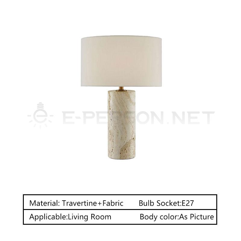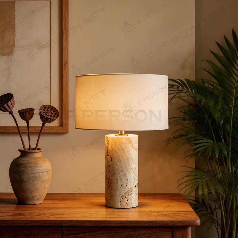 This table lamp features a solid travertine cylindrical base with natural textures, offering a timeless and elegant look. The soft fabric lampshade diffuses light gently, creating a warm atmosphere.