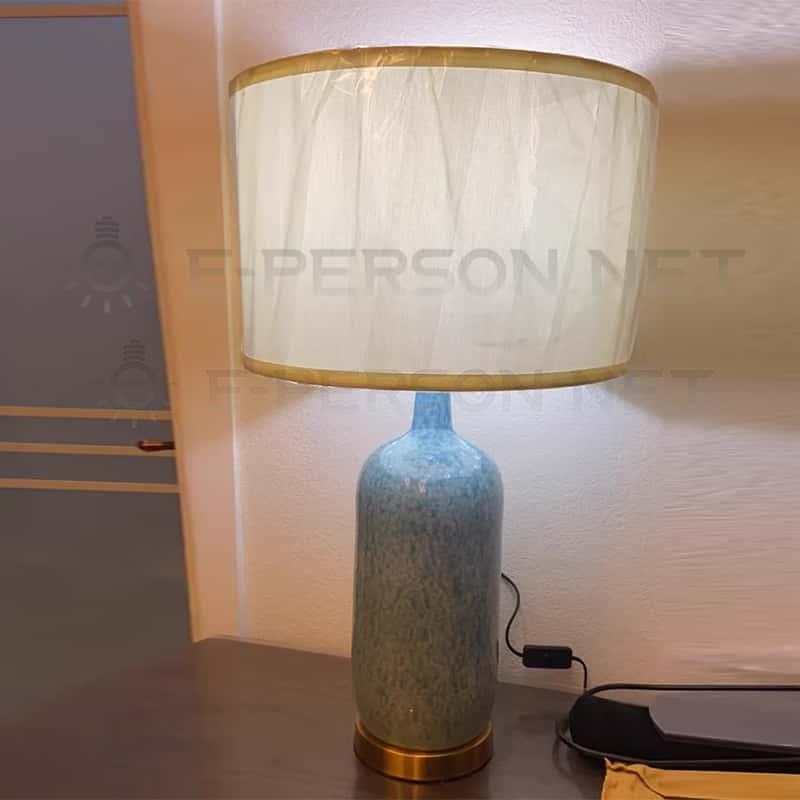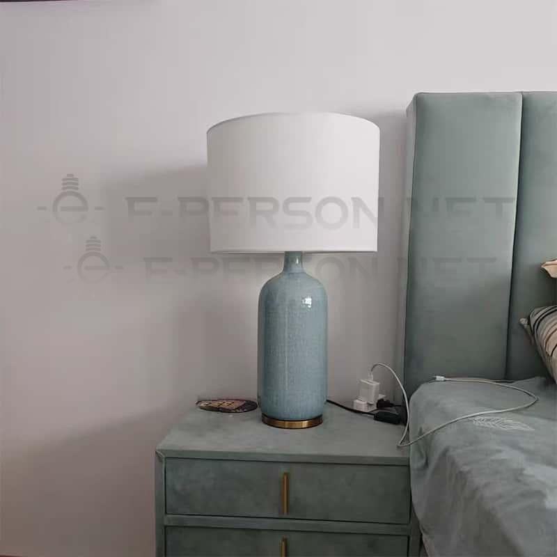 This elegant table lamp features a hand-glazed blue ceramic base paired with a classic fabric drum shade, offering a refined blend of color, texture, and soft ambient lighting. The ceramic body showcases a smooth, artisanal glaze with natural variations, giving each piece a unique, handcrafted character. The warm white fabric shade diffuses light evenly, creating a cozy and comfortable atmosphere.