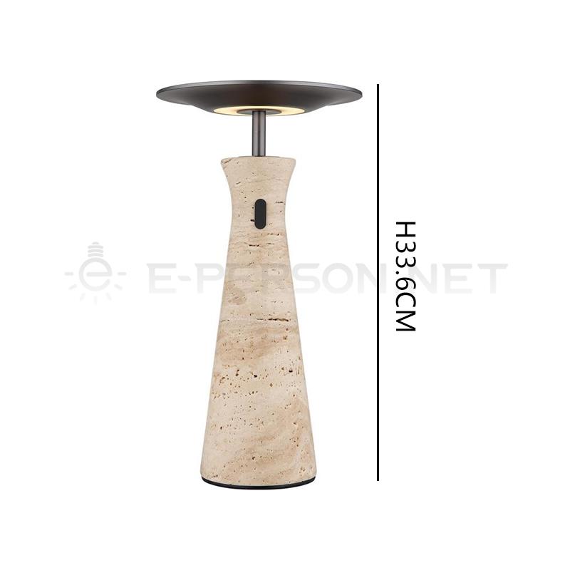 This luxury designer table lamp features a sculptural conical natural stone base combined with a minimalist metal disc top with downward ambient lighting, creating a striking architectural presence. The tall stone base highlights natural texture and elegant proportions, while the metal disc softly directs light downward, producing a warm and refined ambient glow.