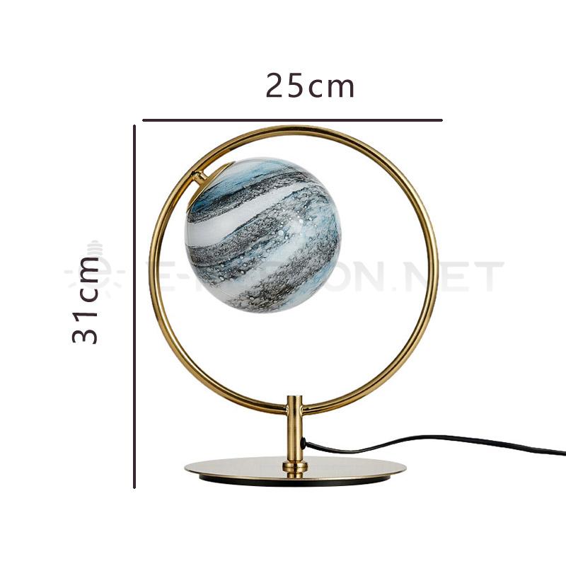 Elevate your space with this modern planet-inspired ring table lamp. Designed with an exquisite handmade glass sphere that resembles a miniature planet, it’s beautifully suspended in a sleek golden metal ring, creating a stunning focal point for any interior. The lamp casts a soft, warm glow that adds a touch of artistic elegance and cozy ambiance to your living room, bedroom, study, or hotel suite.