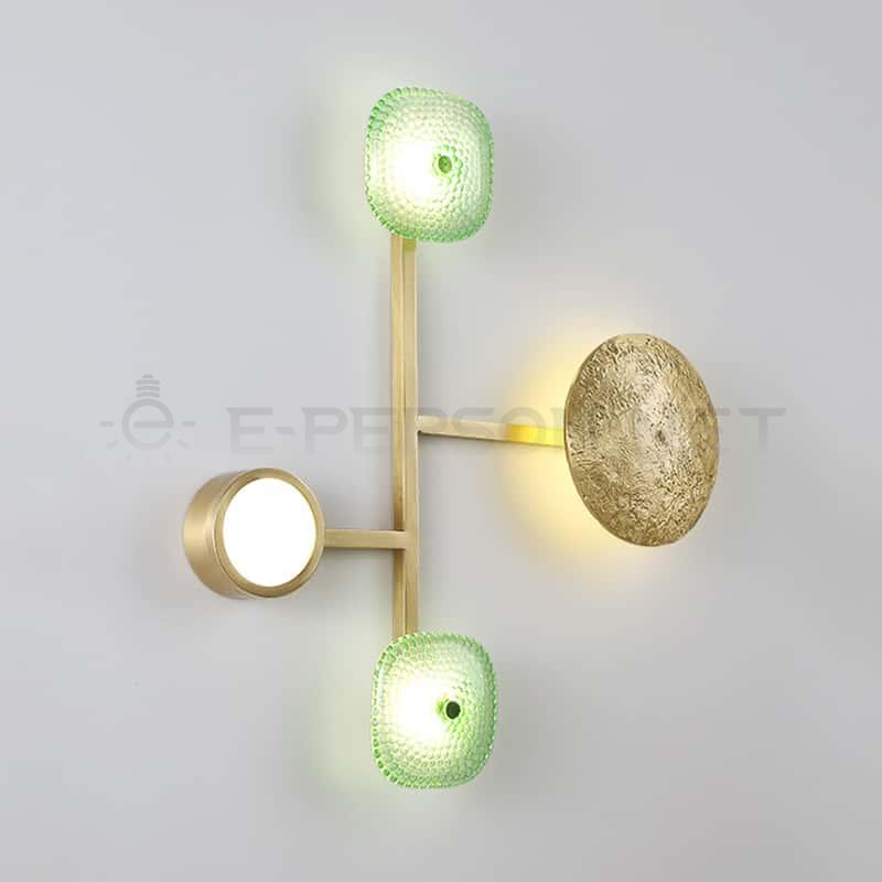 This luxury artistic wall lamp combines modern design with creative craftsmanship to bring elegance and personality to any space. Featuring a large textured gold metal disc, two green honeycomb-pattern glass shades, and a sleek circular LED accent, the lamp offers both functional lighting and striking decoration. Its layered structure and refined details make it ideal for living rooms, bedrooms, dining rooms, hotels, restaurants, and galleries. Perfect for buyers looking for unique high-end lighting solutions that create an impressive and luxurious atmosphere.