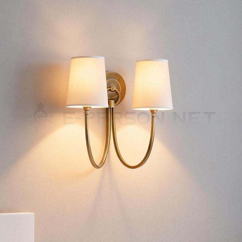 This classic double wall lamp features a refined brass finish metal body combined with two fabric lampshades, delivering warm and balanced illumination.The symmetrical curved arms create an elegant silhouette, making it ideal for both decorative and functional wall lighting.
