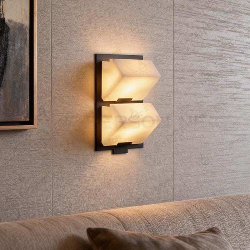 This modern double wall lamp features two handcrafted natural stone shades arranged vertically, delivering layered and atmospheric wall lighting.When illuminated, the translucent stone reveals rich natural veining, creating a warm and refined visual effect.