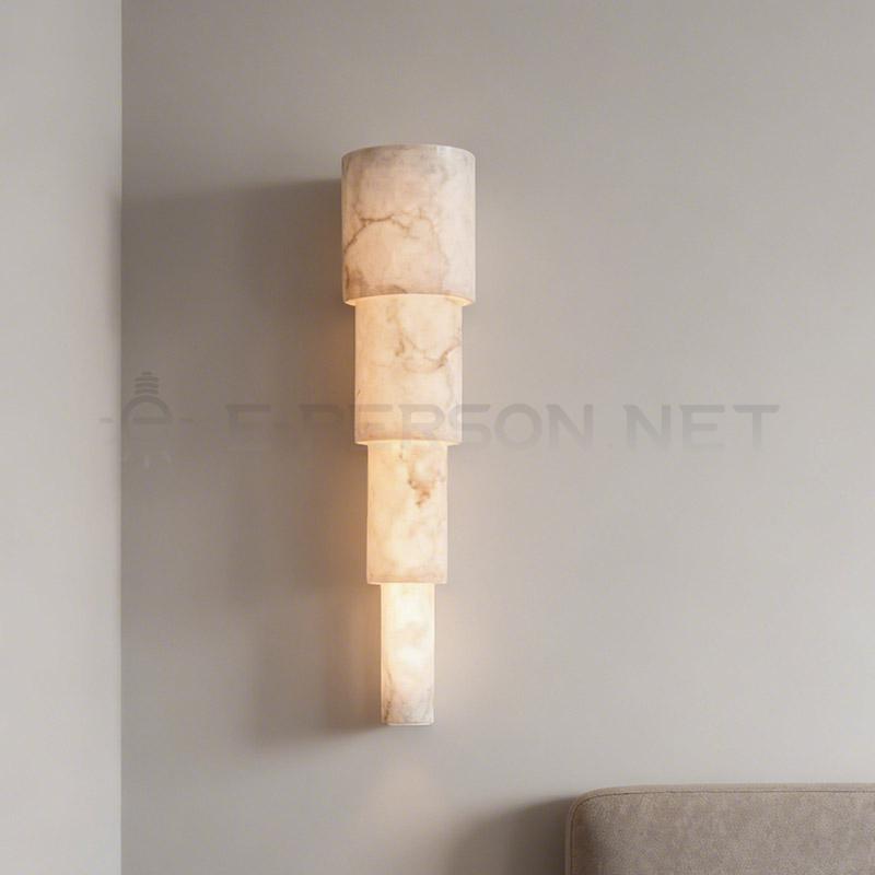 This modern wall lamp features a layered alabaster-style stone structure that creates a sculptural lighting effect. The translucent marble-effect material softly diffuses light, producing a warm and elegant glow.