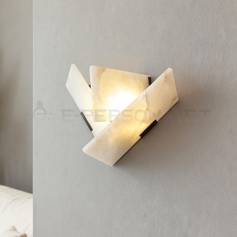 This artistic wall lamp is crafted from natural alabaster stone plates arranged in a geometric folded design. The overlapping stone panels create a sculptural appearance while allowing light to pass through the translucent surface, producing a soft and elegant illumination.