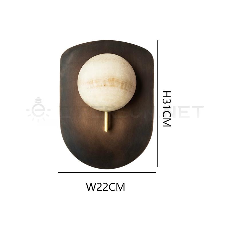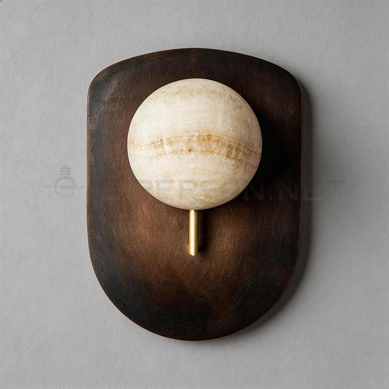 This elegant marble globe wall lamp features a spherical stone shade that creates a warm and soft lighting effect. The contrast between the natural marble globe and the dark metal base forms a modern and sophisticated aesthetic.
